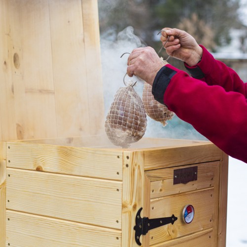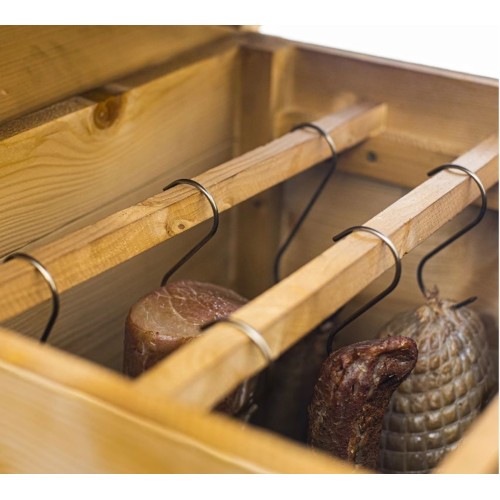 - Kvalitní a odolná konstrukce: Udírna je vyrobena z odolného dřeva (modřín) s precizním zpracováním, které zajišťuje dlouhou životnost a odolnost vůči povětrnostním vlivům.