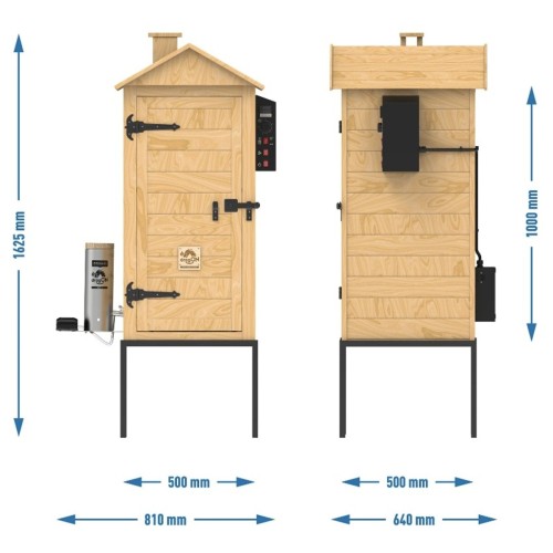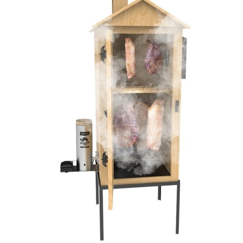 - Vše v jednom kvalitním setu - udírna z výběrového, leštěného dřeva, otevírací stříška, stabilní kovový rám, topeniště, rošt, trámy a háky, vyvíječ kouře s elektrickým čerpadlem.